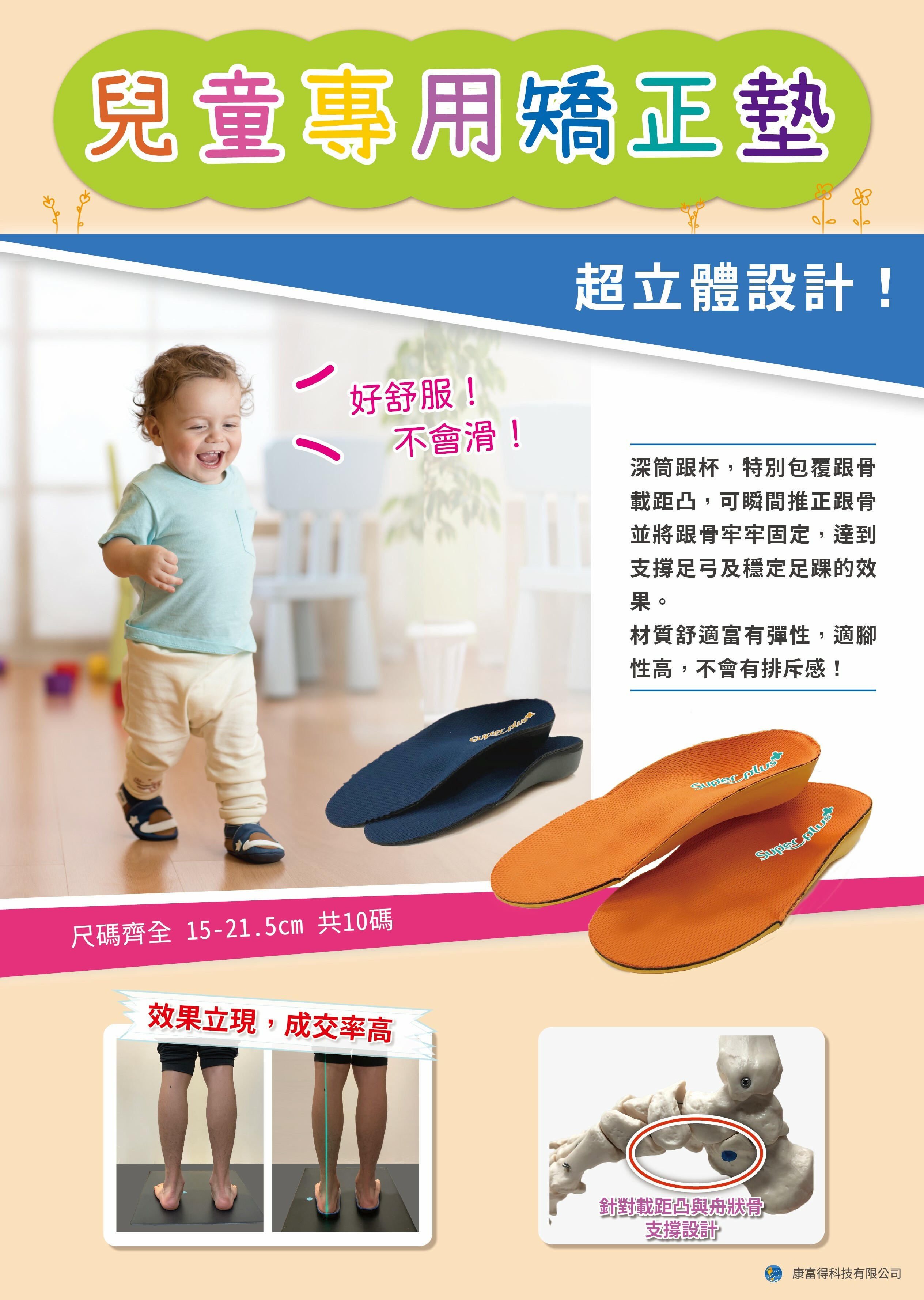 足跟杯深度高達3公分,完整支撐載距凸與舟狀骨,長度寬度符合國人小朋友之腳型,腳長14-22公分皆可穿著!可用熱塑、貼片、研磨、剪裁等簡單手法再做微調。